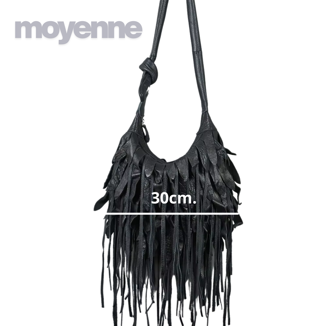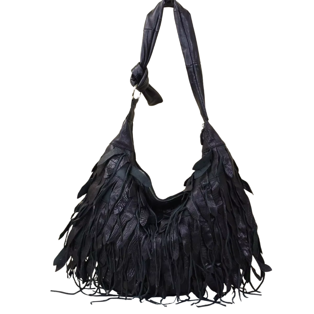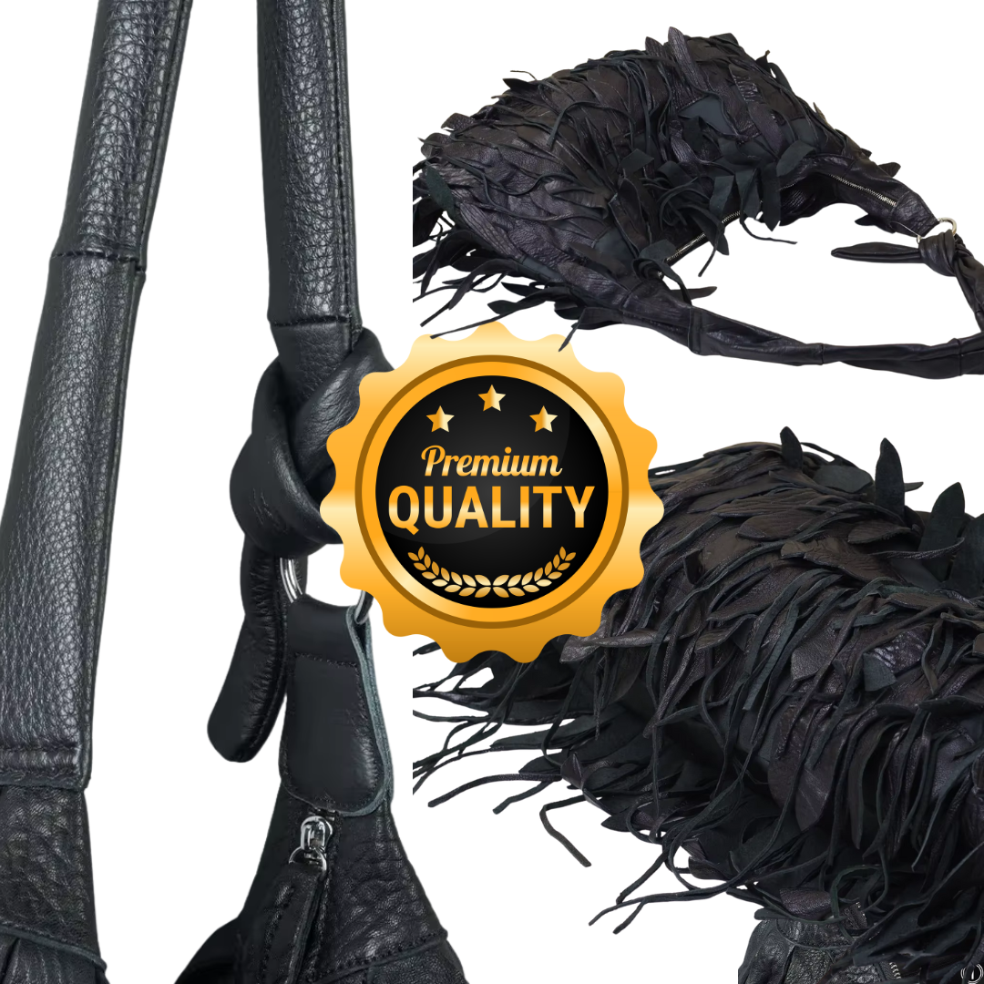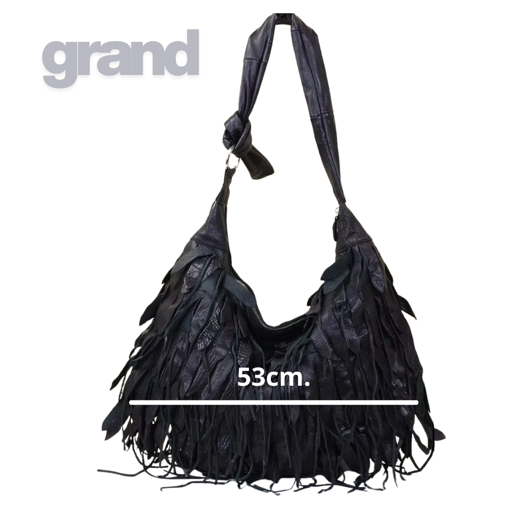 « Elegante e audace, questa borsa in pelle nera con una lunga fascia e numerose frange che la rendono davvero unica, aggiunge un tocco di carattere a tutti i vostri tenue.